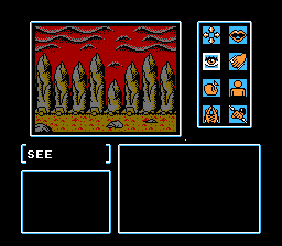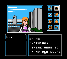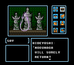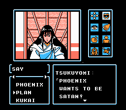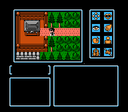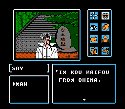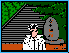 You no longer have a cursor to examine things with, and the text menu has been replaced with a series of icons. One of the major locations in the game is Mt. Koya, where Kujaku’s temple is situated; when you travel around its grounds, the perspective changes to a top-down RPG-style view.
