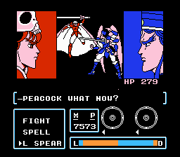 Right away, the art is more colorful and of generally higher quality, while the music is more dynamic and memorable. The game opens with an animation showing Peacock’s hands as he performs the Nine-Cuts mantra, one of his signature moves, before the title screen appears; let it sit for a few seconds, and a short intro starts, announcing the upcoming battle with his twin sister Tomoko in the manner of a TV series previewing next’s week episode. Right away, this signals two things: that at least some care was put into this game, and that it intends to be more faithful to its source material than the first game was.