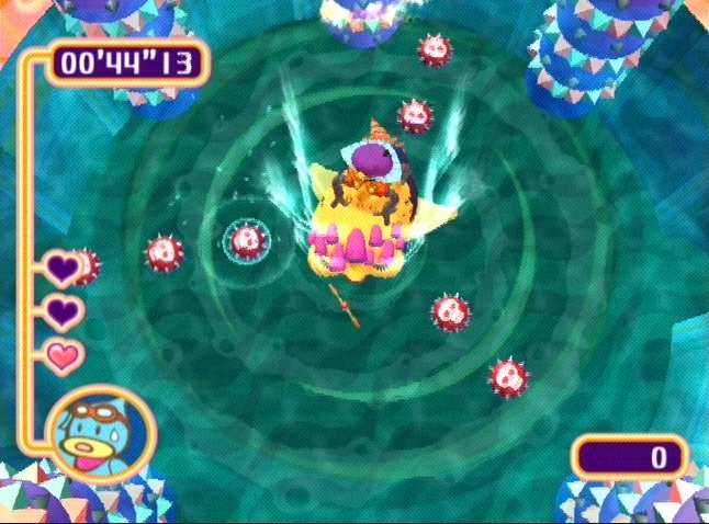 In addition to the standard Helirin, there are now several different kinds of ships. One Helirin has boxing gloves at each end to knock around foes. Another has a pair of lasers. One can twirl around and shoot out miniature hurricanes, which can be used to push objects or block flame jets. Another lets you dive underwater, challenging you to dodge objects both above and below the surface. Most of these play similarly to the regular stages, but there’s also one where Helirin rides on a rail and can shoot flames out of its rotating blades. In addition to these new ships, there are still plenty of stages in the classic style. At the end of each world, you need to fight a boss battle using one of these new Helirins, challenging you at the skills you’ve learned throughout each zone. Including these boss levels, there are a total of forty stages in the Adventure mode of Kururin Squash. With the ability to use the items, most of these are quite easy, especially compared to Kururin Paradise. There are once again plenty of Challenge levels, but these are pretty short, as always. The multiplayer options are limited to a Race mode (similar to the first game) and a Battle mode, where up to four people beat each other up for coins. There’s also a Game Boy Advance mini game that can be played with the GBA link cable, but it’s a pretty crappy matching game.