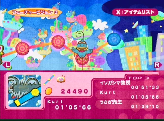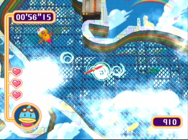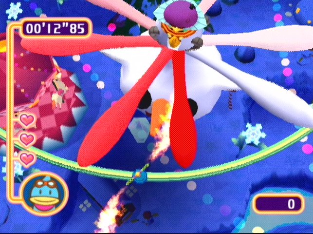 Kururin’s only console installment utilizes 3D graphics while keeping the same 2D mechanics. The visuals aren’t technically all that impressive (cel shaded polygons similar to the style of Kururin Paradise would have been nicer), but they’re colorful and still plenty attractive. In the cutscenes, Kururin and pals are rendered as little cardboard puppets held on sticks, making for some pretty amusing cutscenes reminiscent of a kid’s TV show. Beyond the graphics, the real advantage of being on a TV screen is that the field of vision is much wider, and the view isn’t nearly as cramped as it was in the GBA games. Although it doesn’t utilize true analog control (you still need to press B to speed up), the GameCube controller is much smoother than the GBA directional pad.