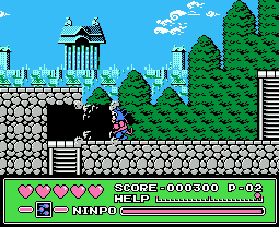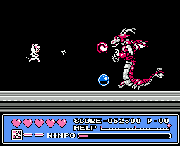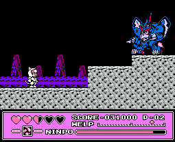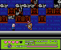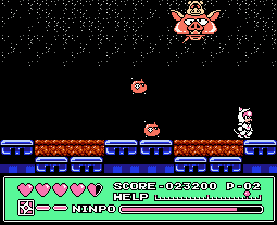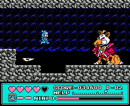 Taking place over 11 stages, at the start of each you can choose between one of the three main cats: Speedy, Guido or Polly. Apart from suit colours there’s almost no difference between, making choosing fairly redundant. In addition to standard attacks each character has a projectile attack by pushing Up and B, a bit like Ninja Gaiden. This can be powered up between three strength levels by collecting the little kanji items, and the stronger the attack the more it depletes your Ninpo meter. You start with throwing stars, next a three way attack, and then basically a power bomb. Ninpo can be topped up by collecting the scroll power-ups, while health is replenished through hearts. Re-entering a room causes all power-ups to reappear, so you’re never short. Each stage also has its own boss enemy.