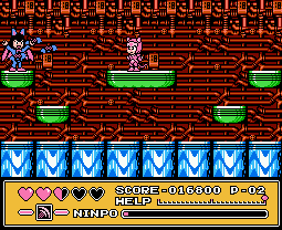 Plenty of other games allow selection between characters with differing abilities, but here it’s especially well done. With something like the first TMNT there wasn’t much difference apart from attack range, certainly none of the turtles could fly. In Bucky O’Hare you first had to rescue a character before using them. In Tiny Toons you basically chose between Buster, who was useless, or one of three others, who couldn’t be cycled between once in a level. The system in Samurai Pizza Cats is much more generous, well balanced with regards to recharging, and actually gives you a reason to switch between them. It’s almost like a less restrictive version of Mega Man’s powers.