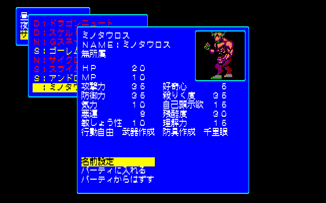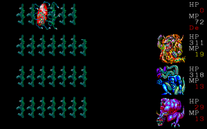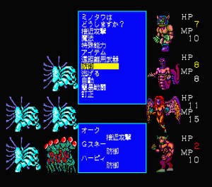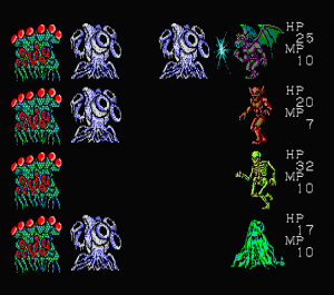 Leveling up has some complexity to it, if still quite grindy. Each of your monsters’ stats are leveled up individually through different actions in battle. You increase Defense by defending, Magical Strength by using spells, and so forth. Each spell also has its own individual level too, contributing to learning future spells. It is quite a bit like Final Fantasy II, but was released a few months earlier, and is even easier to exploit. Grinding Defense is very easy, since Defend nullifies all damage, so grinding it for a few tedious hours at the beginning of the game can mean never taking damage for the rest of the game.