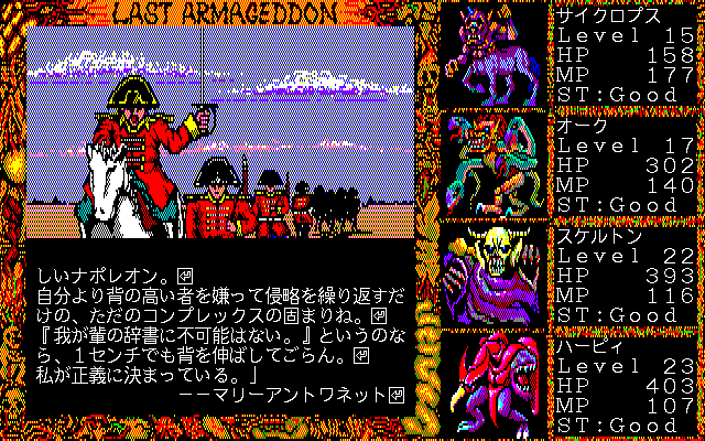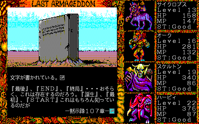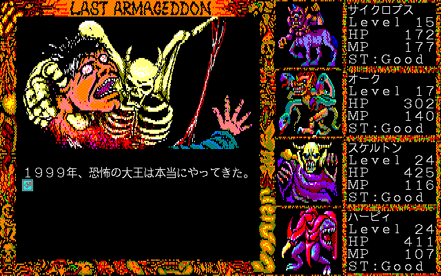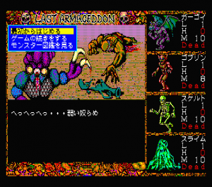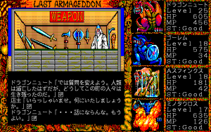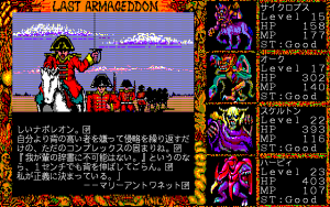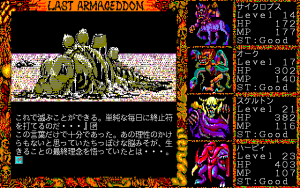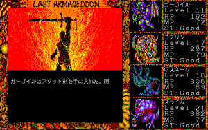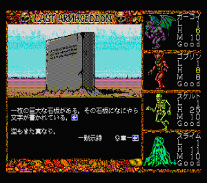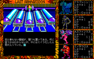 As mentioned, Last Armageddon saw quite a few releases. The original game, released across the MSX2, PC-88, X1, and later PC-98, plays identically across all platforms. There are some significant differences in load time and text clarity, as well as various changes to the screen frame and cutscene graphics.