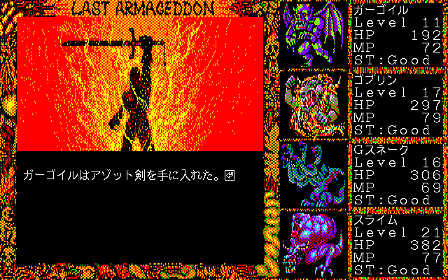There’s a lot to complain about, but Last Armageddon clearly found an audience. Its sales on MSX2 and PC-88 far exceeded expectations, selling out its initial run on the release day. These sales funded the ports to all the other platforms. This probably isn’t that surprising – it seems like a very easy game to market. And while the game is generally trashed on English-language sites, it is remembered quite fondly on Japanese sites, called a “masterpiece” on a few of them. Clearly understanding the dialogue is key to the game’s appeal, and Japanese players may be more enthusiastic about dungeon crawling, as is clear from the Japanese popularity of Wizardry.