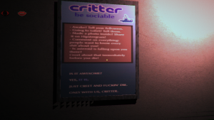The whole thing is amateur, but also very confident in itself where it really counts. Despite every mechanic besides walking being poorly fleshed out or just a downright hassle to understand, how everything is framed makes them (mostly) palatable, and there’s some ambitious ideas at play that are hard not to respect. The game is very aware of its own shortcomings, but then tries to use them to engage in a different way, prodding at the player and even the idea that they’re important to this game at all. Unlike Spec Ops: The Line, which challenges the player to get them to think, The Last Dogma almost feels like it doesn’t care if you actually play it and figures it might as well mess with you from time to time while you’re here.