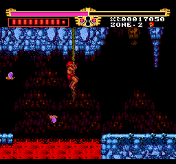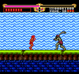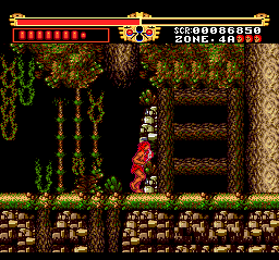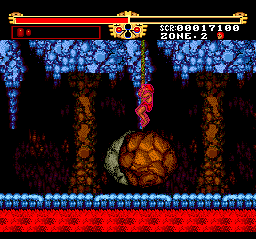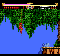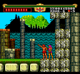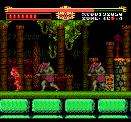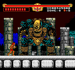 The first stage is easy, but the difficulty increases sharply after Zone 2. The designers really love pits and small platforms so much that they also included lots of enemies that are more than eager to knock you off. It doesn’t help that you get thrown back pretty far when you get hit, due to Gogan being a wimpy girly man who can’t even swim. You can also be like Tarzan and swing from vine to vine, but the controls for this are cumbersome and requires precise timing, or else you’ll fall and die a horrible death. Some of the enemies are hard to kill as well – you’ll often fight three at once, and since they take multiple hits (or a single fully charged hit) to kill, that it’s easy to get overwhelmed. During one annoying boss fight, you’re fighting two boulders and the only way to dodge them is by swinging on the vines in the room. Since it’s so hard to use the vines, you’ll probably end up taking massive amounts of damage before winning the fight.