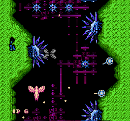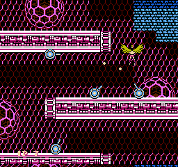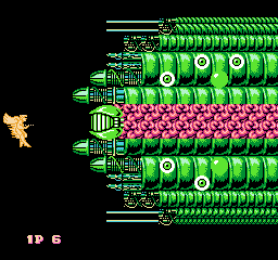 While not too much improved, the NES port does bolster things a bit on the boss front. Instead of a mere brainy core at the end of each Danger area, you take on a duo of giant worms in a super-bizarre dark room surrounded by what looks like a bunch of blue tapioca pudding. They can rear their head out of nearly any surface of the enclosed room and spit out harmful bubbles, though they can be killed quickly if your weapon is fitting. At the end of each vertical segment, after destroying the twin statue heads, a dragon flies out to assault you, flying about in a vague infinity symbol-pattern while blasting out fire and periodically diving towards you at fast speed. Finally, at the end of every palace segment, instead of fighting an easily demolished techno-eye thingy that looks ripped right out of Gradius, you instead take on a hulking battleship that appears to be centrally comprised of brain matter and launches out infinite eyeballs until you destroy its main core, which opens up to blast out deadly brain bits in a large spread. This is certainly one of the most awesome and disturbing sights on any NES game, though the novelty does wear off considering that these bosses repeat themselves for each of the five stages. However, the dragons and brain battleship thingy do at least change color and become noticeably more aggressive for each new stage, and you even have an additional battle at the very end against a teleporting core that may or may not be Dark. It’s a bit of a disappointing final boss, but at least it’s something new and can be pressuring if you’re almost out of lives at this point.