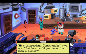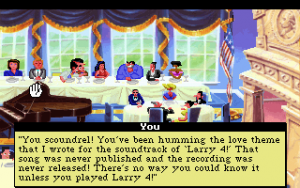 Larry 5 was initially released on floppies, but never got a talkie version. One was planned, that would incorporate a studio audience that would randomly laugh at various lines, but that never came to pass. It was later re-released on CD as part of a budget line, but it’s identical to the disk release. There is no age verification present from this game going forward, although you can choose to password protect your save game.