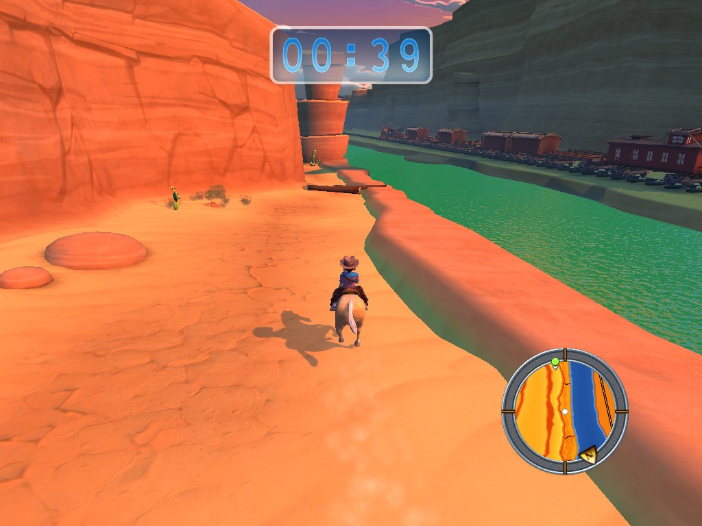 While the first portion of the game takes place solely in the studio, you eventually enter three different “dream” landscapes, based on various movie tropes: “Beefcake Mountain”, a typical Western; “Horror Coffin”, where Larry dresses up as Michael Jackson from the “Thriller” video and fights against Dracula; and “Bytanic”, with Larry taking on the role of Leo DiCaprio on the doomed boat. These provide changes in scenery, but the game’s still the same – more jumping, more fighting, more racing, more fetch quests.