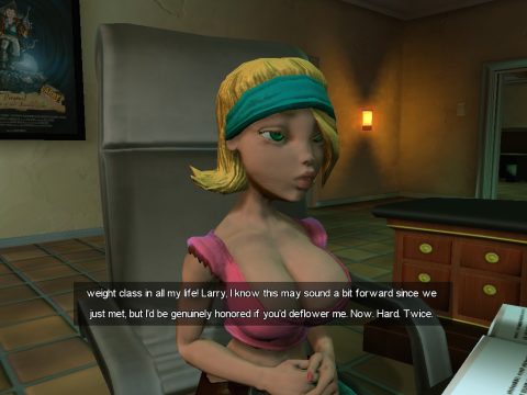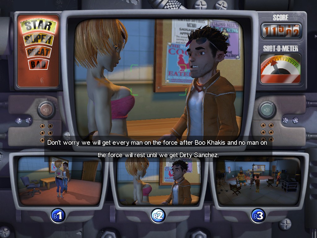 But even worse than the appalling visuals, the awkward controls, and the boring mission designs is the extraordinarily painful writing. Magna Cum Laude was more vulgar than the earlier Larry games, but Box Office Bust makes that look PG-rated in comparison. Everyone tries to make jokes in every line – including Larry, who routinely talks to himself – and none of them are funny, often just relying on curse words and double entendres to get by. All of the characters are extremely unpleasant, even though the game obviously thinks they’re hilarious, like obnoxious actor Damian LeCoque (voiced by Patrick Warburton) or film executive Kip (Jay Mohr). Nikki Cox, Carmen Electra and Shannon Elizabeth also provide some voices for the girls. The “funniest” parts are the mission titles which rhyme with popular movies. How clever! At its worst, some lines are literally just double entendres strung together with absolutely no coherence. For example: