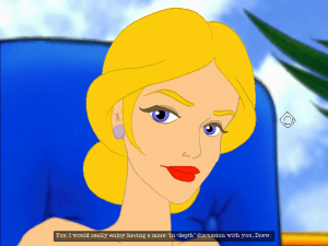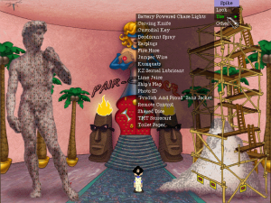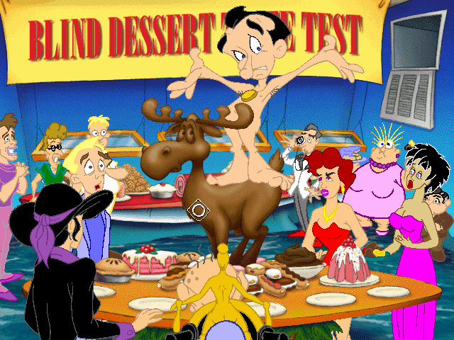 And there are a lot of secrets. Some of the previous games snuck in a quick boob flash here and there if you were persistent, but Love for Sail has hidden nude scenes for all of the main girls. Some of these are pretty obvious, like “push”ing a pesky branch out of the way to get an eyeful of the nudist Drew Baringmore, but some others can be a bit obtuse. As such, it’s quite a bit more graphic than the previous games, although not overwhelmingly so. Winning a girl will also unlock a wallpaper for use in Windows, although they’re easy enough to find on your own if you ruffle through the game’s files. There is an additional “Where’s Dildo?” quest, where several striped, smiling dildos are hidden in the scenery. If you manage to find all of the Easter eggs, score the full 1000 points, and pick out all 32 dildos, you get a quick bonus movie of Larry engaged in coitus with Captain Thygh. Although it’s not terribly explicit, this secret movie was officially cited as the reason why Larry 7 did not appear on the 2006 compilation – even though it received an M rating from the ESRB originally, Vivendi felt this hidden scene would be enough to push it into AO territory.