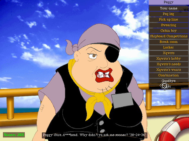 Also, much like its direct predecessor, it succeeds by sticking to its strengths – the chick macking. Technically, the goal of the game transcends merely picking up girls – this is a particular bizarre cruise liner, which runs a contest wherein men participate in a variety of competitions. The prize? A whole week spent with Captain Thygh, the ship’s bombshell helmswoman. (There are also pinup posters of her hung up around the ship, as an incentive for contestants.) Some of these include competitions that rank you based on your skill at craps, horseshoes, cooking, bowling, and love making (measured by a sex machine, apparently). Nearly all of the girls have porn-esque variations of movie star names, including Drew Baringmore, the nudist author; Jamie Lee Coitus, the artist; Dewmi Moore, who just loves a man who can gamble; Wydoncha and Nailmi Jugg, the mother/daughter country-western duo; Victorian Principles, the stuck up librarian who changes her tune once you give her a copy of The Erotic Adventures of Hercules (one of the many gags gently borrowed from The Simpsons); Annette Boning, the old mistress; and, of course, Captain Thygh. Also hanging around is the rotund, foul-mouthed pirate girl Peggie, who thankfully does not have any nude scenes.