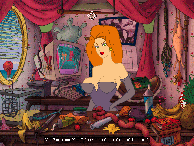 Once again, you’re given free roam of most of the ship at the beginning, and can instantly jump to any room with the help of a handy map. Your command icon is now a condom, which inflates whenever you can interact with something. The interface has been simplified to operate with a single icon – you can click anywhere on the screen to walk, but if you click on an object, a submenu pops up that allows you look at it, pick it up, use any of your inventory items on it, or otherwise interact with it. While most other games that adopted single icon systems tended to dumb down the game, LSL7 actually uses it to its benefit, since it’s much easier to use items instead of cycling through your inventory. It also brings up context sensitive actions, depending on what you’ve clicked on.
