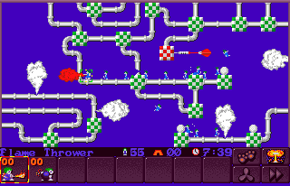 Other gameplay changes include the fact that the lemmings can fall a little further, although long falls will stun them for a couple of seconds. They can also be knocked around by explosions, and it’s possible for them to get blown straight to their death if you’re not careful. There’s also a “fan” button, which lets you use the cursor to blow around lemmings using certain powers, like the jet pack and surfer abilities. Unfortunately, actually controlling the fan is pretty finicky, so there’ll be a lot of times when you blow your poor lemming off course entirely, calling for yet another nuke and reset.