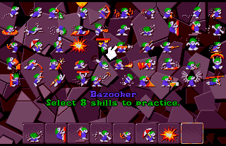 All the powers from the original Lemmings return, and some of the powers work the same way as the older abilities. Other than that, lemmings can now jump, swim, play musical instruments, fly magic carpets, fire laser beams into the air, pour sticky glue, grow plants, spin like a tornado, and turn into a “Super Lemming,” among many others. Since it’s not easy to tell what each power does by the name alone, the game offers a practice mode where you can pick eight powers of your choosing and mess around with them on one of four maps. It’s nice having so much variety in abilities to use, but it does make the game a lot harder to pick up and learn, even if you practice.