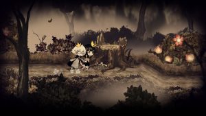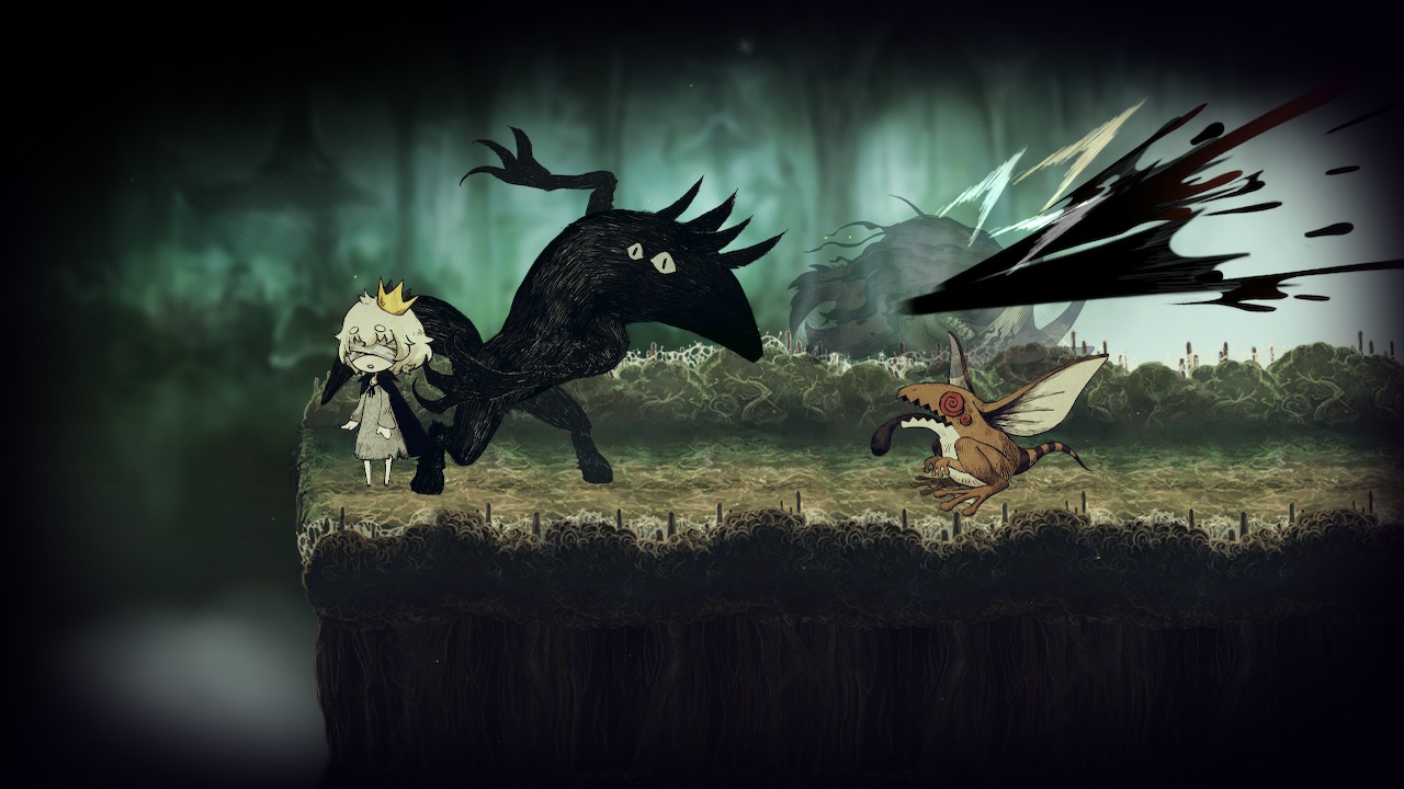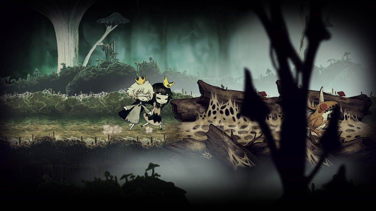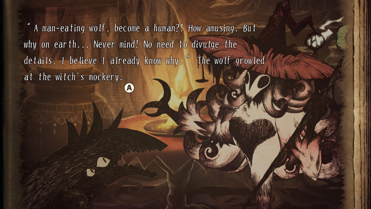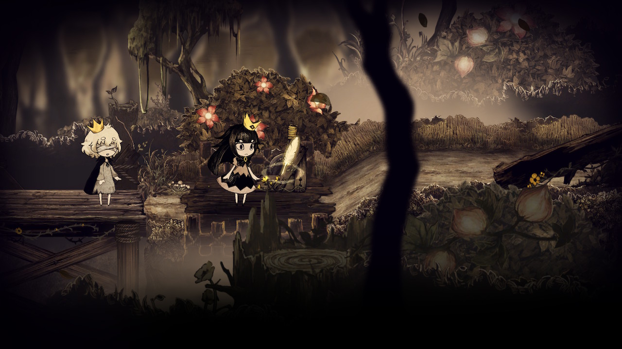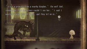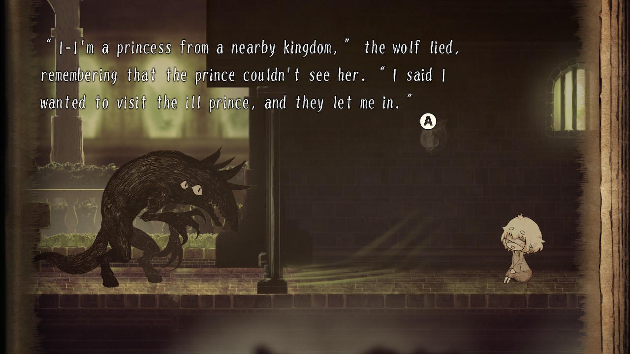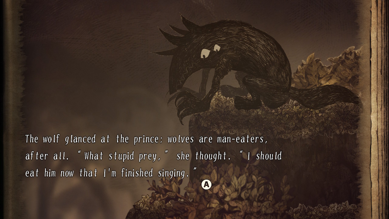 The game tells the story of a wolf, whose beautiful singing voice enchants the prince of a nearby kingdom. While the prince is often content to just listen to the mysterious songs, one night he begins to hunt down the source and comes a little to close. In a moment of panic, the wolf accidentally attacks and blinds him, and he’s forced into the castle dungeon to live out the rest of his days. Wracked with guilt, the wolf seeks the aid of the witch of the forest, who may be able to use her magic to restore his sight. The witch agrees, but observes that the trek from the castle to the witch’s hut is too dangerous for a regular human, let alone a blind one. The wolf doesn’t want to reveal her beastly form to the prince, so she makes a deal with the witch – after sacrificing her singing voice, she is able to transform into a human, allowing her to grab the prince’s hand and trick him into believing her to be a princess. Excitedly, she breaks the prince out of the castle jail, and leads him on a quest through the dangerous forest.