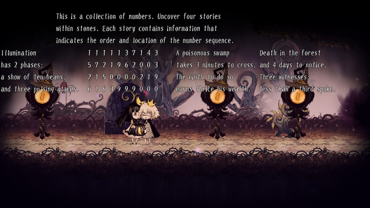 Most of the puzzles are fairly straightforward to solve, revolving around creating safe passages for the Prince, hitting switches to raise platforms, or moving blocks around. The only truly difficult one is revolves around interpreting numerical clues from short written passages, which is so obtuse that the game happily lets you walk right past it. But otherwise, there’s nothing here that will stump much of anyone for too long. There’s even an option to skip stage after a certain amount of time has passed. Each stage has a subgoal to find floating leaves, which will unlock illustrations; some have a single flower that you can give the Prince, which unlocks written parts of a written story to explain the history of the kingdom and the witch.