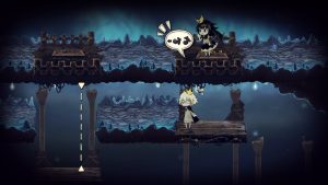 The player controls the Princess, who leads the blind Prince around by holding their hand. In human form, the Princess is rather frail, with limited jumping abilities and no real defense, but in shifting into wolf form, she can jump much higher, take longer falls, and can easily make short work of nearly any foe with her claws. Conversely, as a creature of the night, she’s also scared of flames, so it’s up to the Prince to carry lanterns, which can be lit and carried around to ward off weaker foes and safely explore darker eras. The Prince will stay still on his own, though he can be commanded to walk in either direction or pick up objects. If he gets attacked or falls too far, then he perishes, sending you back to an earlier checkpoint. In other words, it’s basically like a 2D version of Ico, just with the genders swapped.