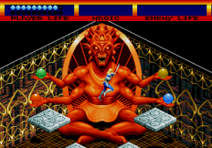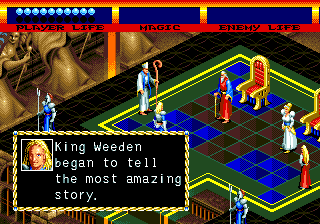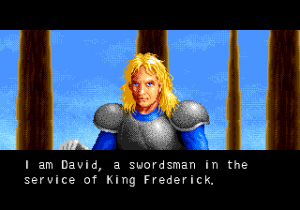 Light Crusader actually begins promisingly, with the game’s title written in a cool font that appears to have been inspired by Roger Dean of Yes album cover fame. (As a side note, the first sword available for purchase in the town shop is called the “Relayer”, which was actually the original title for this game – it also shares the name of an excellent 1976 Yes album. Coincidence?) Upon starting a new game, the player is treated to a text introduction illustrated with shockingly poor stills, badly drawn in the aforementioned Western-influenced art style. This is followed by an oddly animated sequence showing the hero riding his horse through a forest, en route to the task at hand. Finally the hero is seen, in the game engine, at the foot of the King, who predictably asks for help.