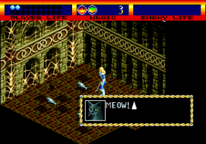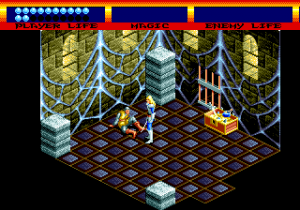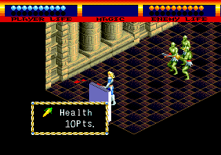 On the bright side, the music is well done. In the dungeon, it is context sensitive though thoroughly scripted (a rarity for the time), and this works well as a device to create suspense and generate fear. Overall composition is also very different when compared to any of Treasure’s other efforts. The music in Light Crusader employs a sparse, baroque meets ambient approach. The town music is a catchy fugue. Dungeon music ranges from atmospheric to heart-pounding. Even with the fact that the item/map screen tune is basically stolen from “The Lamb Lies Down on Broadway” by Genesis (specifically, Silent Sorrow in Empty Boats), the sound on the whole is easily the most fully realized, and best, part of the game.