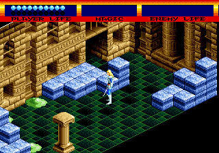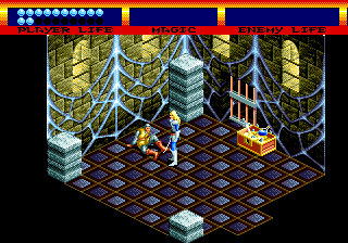 Another odd thing going on graphically with Light Crusader is that some of the effects are polygonal in nature. Doors are flat-shaded polygon objects that open in 3D space. When the hero strikes a wall or kills certain enemies, the particle effects consist of a burst of tiny, flashing triangles. While not completely appropriate in terms of the game’s aesthetic, they are pretty cool to look at. Also, to its credit, the game does a good job of implementing a real sense of depth and weight to the environments; though there is a propensity toward blind leaps of faith. This is due to the fact that the foreground objects do not become transparent like they would in later games of this type on more powerful hardware. Understandably, you cannot rotate the camera to alleviate this either. Overall, the visuals in Light Crusader, with the exception of the polygonal touches, are decidedly mediocre at best. Normally, this wouldn’t be such a big deal, but when compared with any of the other games Treasure released for the system, this one doesn’t quite stack up.