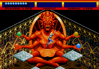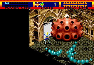 Graphically, Light Crusader is inconsistent. Despite any qualms with the art style, the characters look pretty decent in-game, if a bit anorexic. The backgrounds are also passable, though generic in a way that is almost forgivable. The map and item screens are simplistic, but legible and relatively user-friendly. The main character is well animated, though his movements are awkward. Apparently Treasure just doesn’t do “realistic” humans very well. The various baddies the player comes across in the single large dungeon are okay as well, but none of them are overly interesting. Conversely, the bosses are well-drawn and also have the distinction of being some of the only designs that seem like they could be from a Treasure game. Must be the patterns.