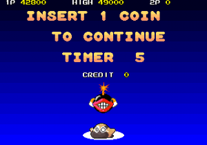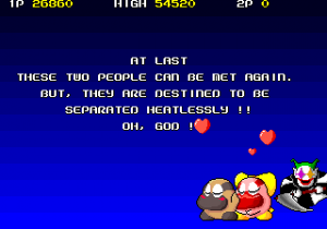 One amusing thing is how often Hipopo is played for a fool. The intro sequence has a random image of him selected from his dying animations (crushed, electrocuted, burned…), one intermission has him find Tamasun only for her being replaced with an enemy without him even noticing, and the continue screen countdown has the seconds ticking in unison with a bomb enemy bouncing on Hipopo’s head, who then explodes when the screen fades to black if you don’t insert any credits. It’s a strange way to inject some personality into him, but it’s still endearing.