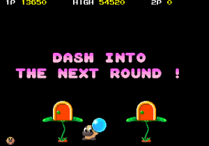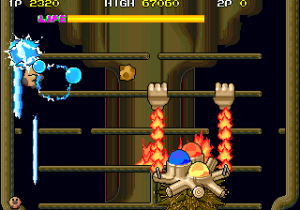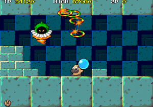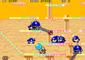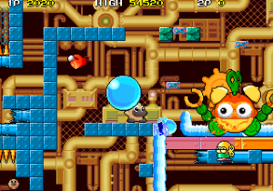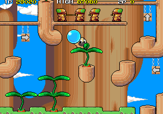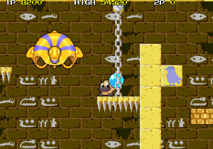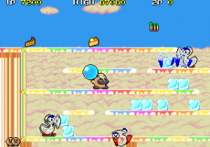 One factor for this change of pace is Hipopo’s weapon, water bombs, which aren’t nearly as quick and precise as Tiki’s arrows and laser beams. The water bombs travel in an arc, bounce, and then explode in a water stream. If it touches any enemies, they won’t be killed but rather frozen in place temporarily, allowing Hipopo to push them against walls, or each other to create big score chains. (Five or more enemies in a row gives you a random special bonus). Basically, the bombs are a cross between Bubble Bobble‘s water bubbles and the snowballs from Snow Bros., a single screen platformer by Toaplan that was released in the same year.