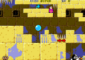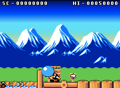 The graphics are pretty good and help convey the cutesy, relaxed feeling of the title. The settings are mostly typical of other platformers from the 90s, including a factory full of hazards, an Egyptian stage with many tricks and traps, and the evil dark castle at the end, all drawn in a fairy tale style, but without the surrealism and “anything goes” quality that The NewZealand Story had, going for more internal consistency.