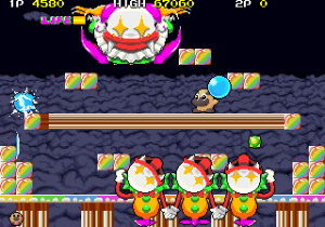 Hipopo and his enemies are typically cute, rotund Taito creations, short on animation frames but rich in personality. Special mention goes to the goofy end-stage bosses including the final one, a demon that looks like a wizard clown. Several enemies, being the Fire Devil’s minions, are related to fire, such as living bombs and flying Venus flytraps that spit fire, but the majority is just random creatures not always related to the theme of the level, including splitting amoebas and mechanical ducks that swallow your water bombs. The folks to be rescued are far more varied than the kiwis from The NewZealand Story, and range from kids to old men, from hicks to nobles. Even the time-out enemy, who chases you if you dawdle, is bizarre – a green-haired clown in a checkered dress with a scythe.