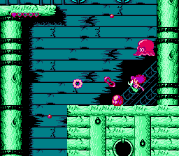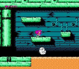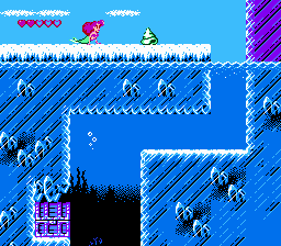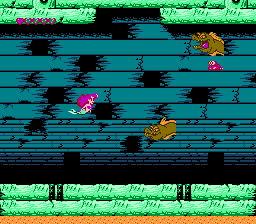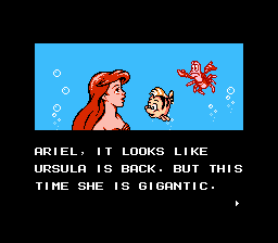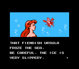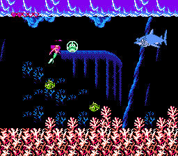 The Little Mermaid also doesn’t look as good as it could. Many of the backgrounds are barren, while the actual stage itself is boring. It would have taken very little effort to add something-either fish or plant life- to the backgrounds and stages. The level designs are bland as well. Each stage involves swimming around boxes or up passageways while avoiding an occasional murderous guppy. To its credit, the boss fights are more interesting than the ones in The Rescue Rangers, but that’s not saying much.