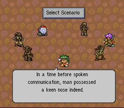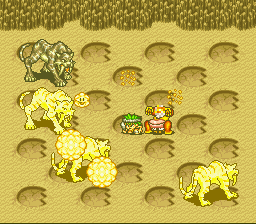 Game-wise, the Stone Age chapter is one of the more sophisticated and open-ended ones. It’s the only one with anything like a shop, taking the form of a barter system whereby you can trade in different combinations of items won in battle (hides, horns, sticks, rocks, and such forth) for new and better items. In practice, unfortunately, this system amounts to combining everything you get with everything else and hoping you don’t lose something rare along the way. You’re also free to wander the land and engage in battles as much as you want. Rather than random encounters, Pogo finds animals with his powerful sense of smell; pressing Y causes clouds to appear on the screen, representing scents that can be tracked to initiate battles, or in some cases to advance the larger plot.