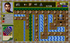 Much of the game works on its own, governed by set algorithms. One of the major things you have direct control over is the tax rate – money is needed to build things, but if the tax rate is too high, then you won’t be able to produce any more workers. Therefore, you constantly need to switch it back and forth to suit your needs, but otherwise the building of structures and creation of units is handled automatically. Technically you can take control over a single unit at any time, though this is mostly used for specific tasks like building (or destroying) barriers and bridges. Instead, you can set the AI of all of your workers to do a specific task, like building in certain area, or setting them to aggressively attack the enemy. Technically there is only one type of unit, which has set strength and health values based on assorted factors (primarily your overall population, who are used for both building your villages and destroying others. But you can command your workers to continuously pile into a single unit, eventually growing more and more powerful as more clamber into it.