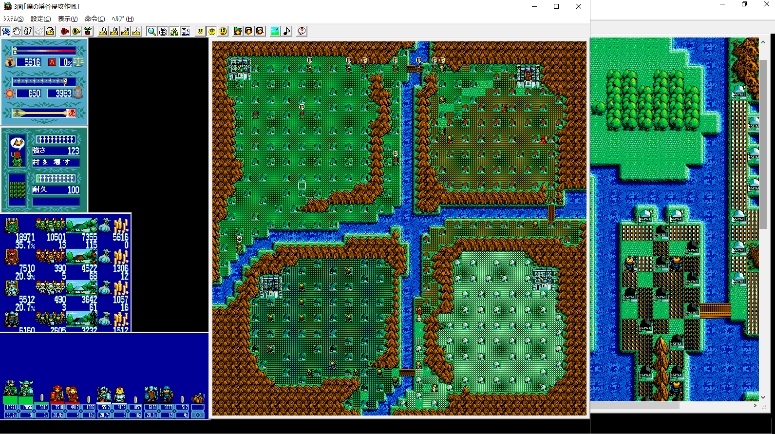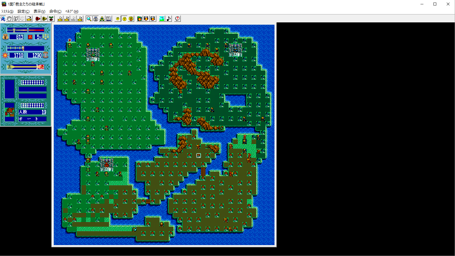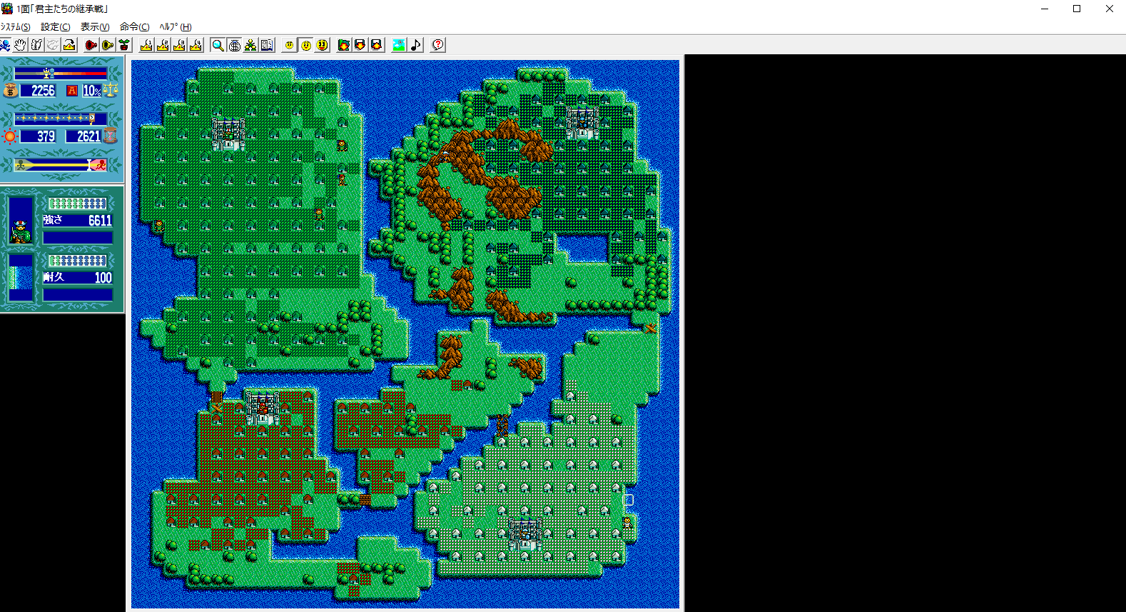 There are tons and tons of ports and release of Lord Monarch, though there’s not much that actually changes from its initial release. The first version, just called Lord Monarch, was released in 1991 for the PC-98. Advanced Lord Monarch was released shortly thereafter, which includes new maps, an advanced mode with improved AI, and a different way to calculate ranks. Both of these versions were ported to the FM Towns with enhanced 256 color graphics, along with CD audio support. Both PC-98 versions have map creators. Most of the later versions don’t have this ability, but fanmade map creators were produced. The interface in these versions is pretty clumsy, because it’s difficult to switch between the map screen and the status screen – you need to hit buttons on the keyboard to access it.