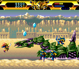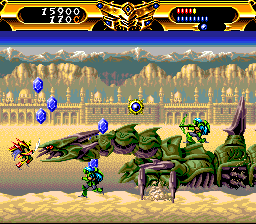 In addition, Landis also has the option of buying things before he begins each stage. Enemies, besides dropping the occasional weapon and life power-ups, mostly drop crystals, which can be exchanged for items in the shop. These include extra bombs, life and weapon power-ups, as well as shop-exclusive items like the shot deflecting shields, extra continues, and the elixir, which fully restores your health should you deplete your initial stock.