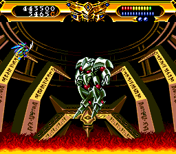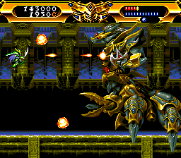 Landis himself also has a few quirks. His sprite is larger than, say, the Vic Viper or R-9, in addition to enemy shots being larger than in other shooters. Landis’s sword is a very powerful weapon, more powerful than most normal shots. The caveat to this is that he has to completely stop shooting to use it – fine if it was part of your strategy, but annoying if it happens by accidentally flying too close to an enemy, allowing other enemies you would have hit to get some cheap hits in. It’s worth noting that Lords of Thunder is not a one-hit kill game, though you lose weapon energy when hit, not to mention that each stage must be cleared in one life, as there are no mid-level checkpoints.