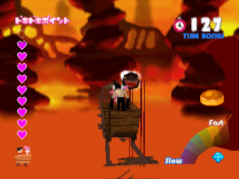 As you navigate levels, making it to the end is rarely the most challenging part. The focus here is more on keeping your chosen girl satisfied by collecting enough items and keeping her out of harm’s way by ducking with good timing. Keeping your speed high is also important since it’s required to make some jumps and retain your time bonus throughout each level. Tons of fruit is scattered throughout levels and having the guy stand up to collect it will increase the girl’s favorability towards you. Each girl has a favorite fruit that provides a bigger boost, but missing any fruit results in a penalty to the heart meter. You can also collect hamburger ingredients to try and create their favorite burger, though collecting the wrong ingredients will upset her instead. The most important items are the hidden diamonds, which not only make the girl very happy, but also put you on track for the best ending. Finding these is a matter of making the correct turns on the track that lead to a key, so once you know the courses, it’s just a matter of repeating the same paths. At the end of each level, your two characters will have a brief heart-to-heart, the tone of which is determined by your performance.