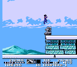 The enemies and bosses are a bit of a mixed bag, though it cannot be denied that most of them look really bizarre. The very first level alone gives you robots with incredibly long knight helmets and floating cloud-like droids with skulls. Other notable enemies include hopping mutants that chuck boomerangs, floating faces that fire off waves, and somewhat cute flying gremlins with shields. The animation on most sprites tends to be oddly paced, not quite choppy but not really fluid either, though they look decent for a mid-generation NES game. The first chapter provides respective examples of a neat boss, a lame boss, and an awesome boss in that order. The first boss is some industrial alien who attacks you with a giant crane, but the next is just some malformed weirdo who marches back and forth shooting at you. However, the entire third stage is a big boss fight against some massive winged floating machine where you have to jump up platforms inside of it and stab it in its demonic robotic head. Bosses continue to vary in degrees from boring (a bizarre snake with a man head who only floats around) to awesome (a fireball-spewing alien at the end of the submarine level) to frustrating (a four-armed ceiling dweller who keeps chucking red potions!)