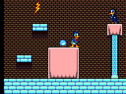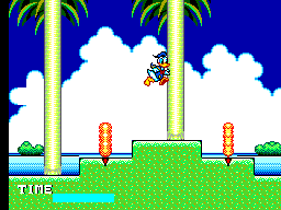 It follows the basic platformer structure, and feels similar to Castle of Illusion in many ways. There are few on-screen stats of any kind and no points shown, rather just a time bar and a power counter. In addition to jumping over the gaps and other environmental dangers, there are many adversaries trying to stop Donald at every step. The main weapon in the game is Donald’s hammer, which he starts each level with. This hammer remains in his possession until he is hit, though he can jump on the top of enemies to defeat them, and they will leave behind bonuses and weapons at random which enables Donald to equip the hammer once again. These bonuses can also be diamonds to improve your high score at the end of the level, 1-ups or stars. The stars is what is used to power up Donald’s weapon. Each star collected shows a small red dot on the left side of the screen. At 1 or 2 stars, nothing happens, but on the third, your weapon gains twice the speed and at 4 Donald becomes invincible for 15 seconds. After picking up 4 stars however, the power resets and the weapon goes back to normal, so it’s wise to avoid picking 4 stars and just keep the fast weapon. Donald can also equip a frisbee, which can be shot in multiple directions.