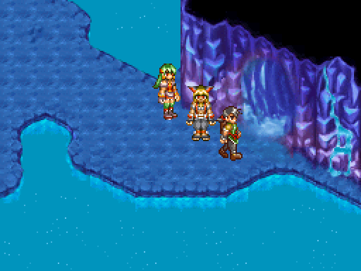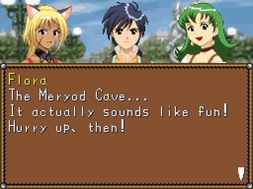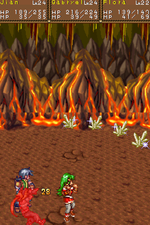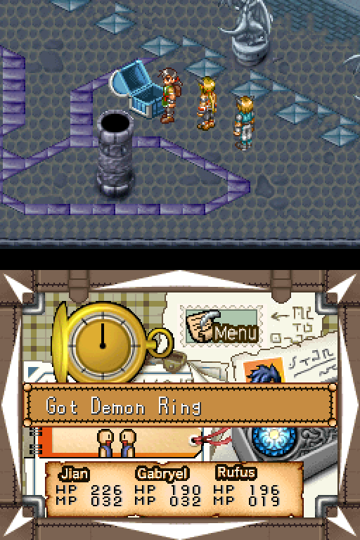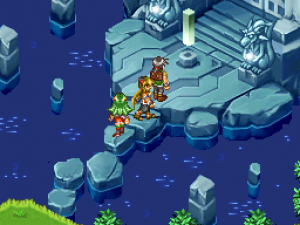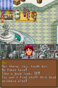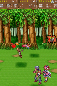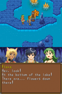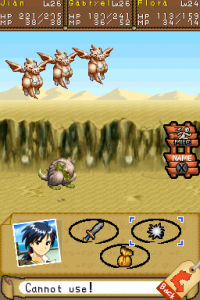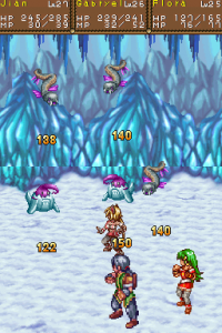 Moreover, the series was defined by its anime cutscenes, along with plenty of voice acting and some vocal songs. There’s none of that here. The game doesn’t even look visually reminiscent, seeing as the super-deformed characters are replaced by more realistically-proportioned sprites. (The PSP remake of Lunar went the same route, but at least they kept the same visual style, whereas this could be any generic RPG.) The character designer, Toshiyuki Kubooka, returns from the old days, but he was clearly having an off day when he designed these incredibly bland heroes. Lucia even looks like a recycled character design from one of the tertiary characters from Magical School Lunar!