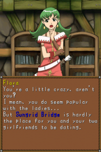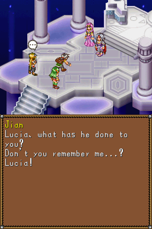 The English translation is sterile and boring, a particular offense considering that the original games were known for their lively localizations. Say what you will about Working Designs’ occasionally inappropriate humor, but their writing was incredibly lively and largely what defined the series for English speaking gamers; Dragon Song was localized by Ubisoft, who only put in the very basics of translation work. (The earlier Lunar Legend was also localized by Ubisoft and suffered the same problem). Lucia has a somewhat tsundere relationship with Jian, and various female NPCs have a tendency to strongly flirt with the hero, but they come off as weirdly robotic instead of goofily charming.