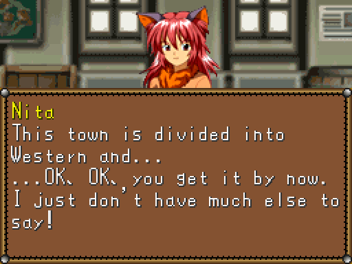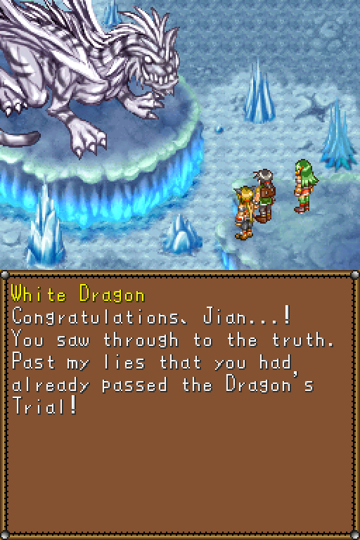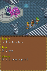 Seeing as the game is a prequel, taking place 1000 years before any of the others, it’s completely divorced from any of the characters that Lunar fans knew and loved, in some places even contradicting canon. Lunar 2 also took place a century after the original, but it also took care to add links between the two games – Lunar DS barely does this. Early designs at least included the presence of the floating city of Vane, but it is nowhere to be found in the completed version. Some location names will be familiar, and the enemies are part of the Vile Tribe, but those references are skin-deep. The only thing it really adds to Lunar lore are the racial tensions between the Beastmen (dumb but strong, and living in cities) and Humans (smart but weak, and concentrated in rural areas), which weren’t really a part of the other Lunar games. However, the game isn’t written smartly enough to deal with its intricacies, and doesn’t really say much more than “racism is bad”. It can’t even get the climax right – you only fight Ignatius, the main antagonist, once, halfway through the game, in an unwinnable battle. The actual final battle is against his underling Gideon, after which Ignatius proceeds to fall off a cliff.