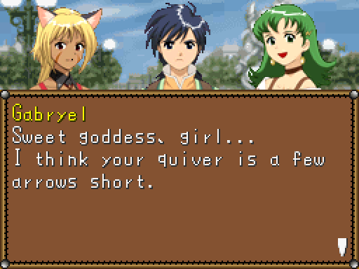Known to friends as Gabi, she’s a beastgirl and daughter of the Beast King Zethos. She’s sort of like an analogue to Jessica in this way, but she’s skilled in physical attacks rather than healing spells. Note that “beastmen” in this game occasionally includes “catgirls”, instead of just the elf-like creatures seen in the other games.