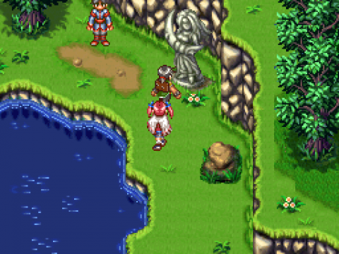 Moreover, the series was defined by its anime cutscenes, along with plenty of voice acting and some vocal songs. There’s none of that here. The game doesn’t even look visually reminiscent, seeing as the super-deformed characters are replaced by more realistically-proportioned sprites. (The PSP remake of Lunar went the same route, but at least they kept the same visual style, whereas this could be any generic RPG.) The character designer, Toshiyuki Kubooka, returns from the old days, but he was clearly having an off day when he designed these incredibly bland heroes. Lucia even looks like a recycled character design from one of the tertiary characters from Magical School Lunar!