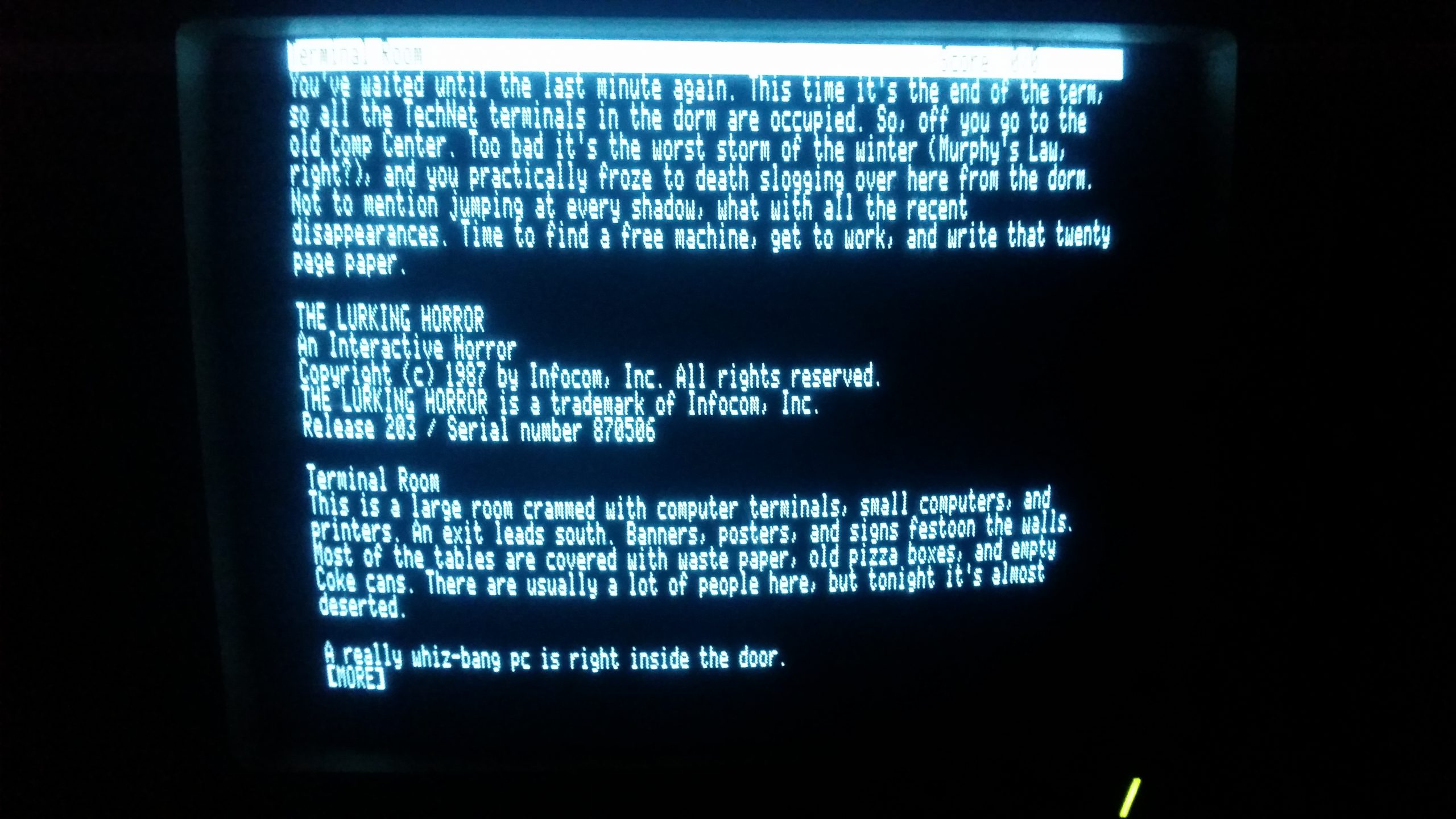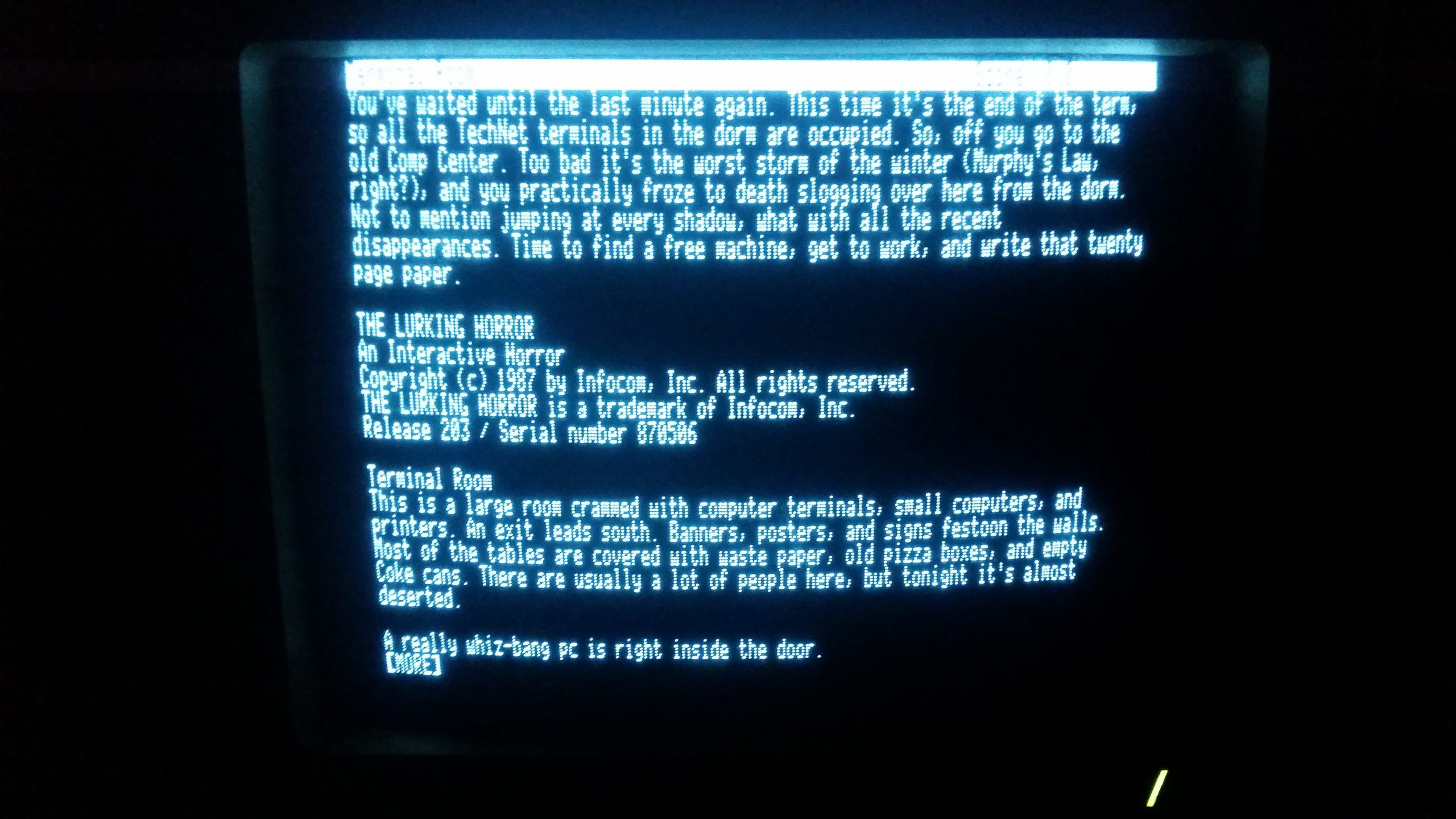 Infocom created some of the best text adventures of the 80s, starting with the seminal Zork fantasy series, branching off into comedy and sci-fi with Planetfall and Leather Goddesses of Phobos, and mystery with The Witness and Suspect. And yet (this applies to the rest of the adventure game genre) there was a curious lack of horror games during this time, with one of the only similar titles being ICOM’s The Uninvited. The only one in Infocom’s entire library was their 1987 release The Lurking Horror. This was designed by Dave Lebling, one of the designers of Zork and also one of the founders of the company.