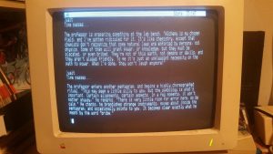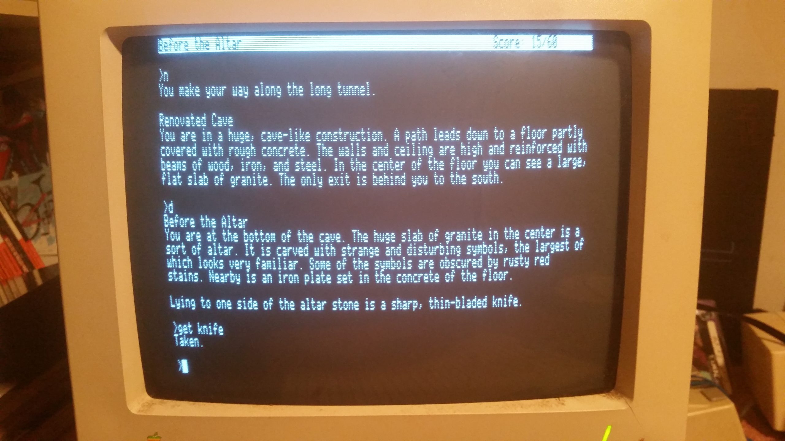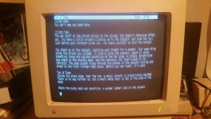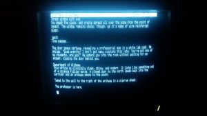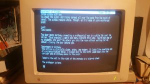 The rest of the game involves confronting the professor about his ritual while avoiding being sacrificed, and then banishing the horrible creature itself. It’s pretty obviously inspired by H. P. Lovecraft (more the appearance of tentacled cosmic horrors than the overt racism), predating any of the actual Cthulhu video game tie-ins by a number of years (though contemporary reviews were more eager to compare it to Stephen King, as the actual writing is nothing like Lovecraft’s). Like most Infocom games, the writing and descriptions tend to be pretty straightforward, resulting in an occasionally dry sense of humor, when it says basically things like (paraphrased) “You’re outside in the deep snow, and oh also, there’s a winged demon just sorta flying around”. The text rarely gets gruesome, though, even during the death scenes, with the scares coming more from the stark, lonely atmosphere, and an escalating sense that things just aren’t right. The Amiga version also support digitized sound effects for certain events and actions, though there are only about a dozen of them. They do play suddenly though, as the entire rest of the game consists only of silence and the player’s keyboard taps, so they’re good for occasional jump scares.
