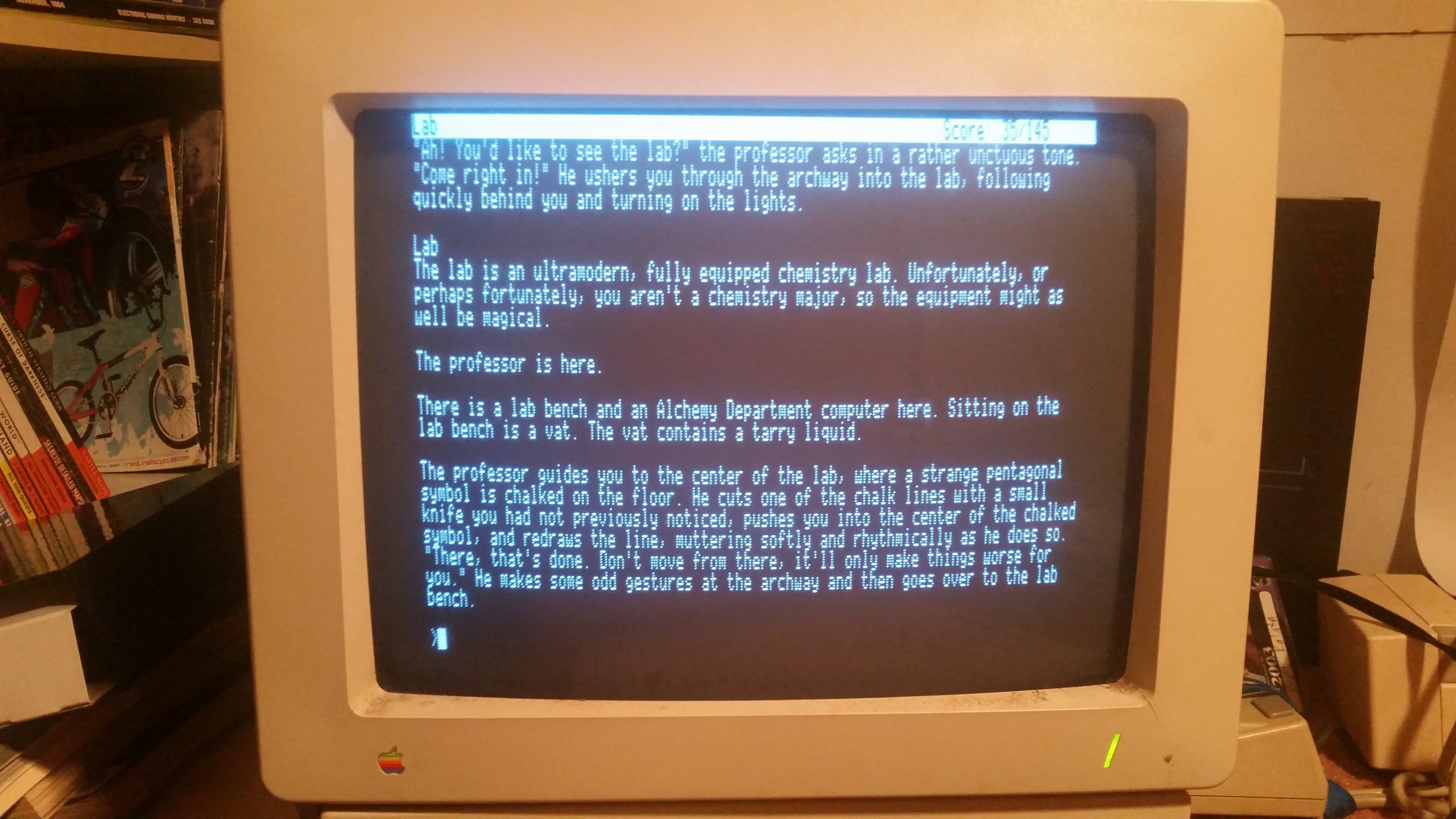The story takes place at GUE Tech, a reference in name to the Great Underground Empire from the Zork games, but also an explicit analogue for MIT (Massachusetts Institute of Technology), the school attended by many Infocom staffers, Lebling included. It’s the night before your term paper is due, causing you to scramble to the computer lab, while a blizzard has covered the campus with an extraordinary amount of snow. If your luck couldn’t get any worse, your paper seems to have been overwritten by the ramblings of an insane person, much of which seems to revolve around resurrecting some mysterious, otherworldly entity. Your investigations place the source of this particular document as being the school’s “Department of Alchemy”, something which obviously shouldn’t exist in a school of science. But this, along with a weird dream you have after reading the document and a reference to a mysterious student suicide, gives clues that something sinister is going on.