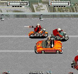 The game is fast, with a constant stream of enemies trying to run you off the road along with a few pitfalls and jumps to navigate at the same time. The game is played a joystick and just two buttons, one for accelerating and one for attacking in whatever direction our hero is facing. The entire time a constant stream of enemies are riding and gliding in try to run our unnamed hero off the road. Fortunately, the resident Mad Motorist, we’ll just call him Mad from now on, as its emblazoned on the back of his cape coat (Mitchell must have had some fans of both Akira and Mad Gear members Two P and J from Final Fight), has a pair of metal tonfa strapped to his arms, allowing him to steer while still clubbing enemies at a distance. The game keeps up the intense pace with a few ambitious techniques players can use to tip the scales to their advantage as well. The best of these is that when an enemy is destroyed, Mad can ride into the explosion to jump into the air, also destroying any vehicles he lands on. Another trick is that if players are moving left as they let go of the acceleration button, Mad will swerve his bike slightly, blocking and damaging anyone catching up to him without taking any damage himself.