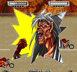 The thing that stands out Mad Motor, however, is what happens when Mad has sustained enough damage from enemies. Players are only given one life before having to pop in another quarter, but when it’s almost empty, Mad undergoes a painful transformation, screaming “I’m alive…WOLF POWER!” as some close up artwork of his change is flashed across the screen. From this point on, a single hit will end the game, but Mad is much stronger, his attacks have a wider range thanks to massive blades mounted on his elbows, and even his bike transforms into a bigger machine resembling some of the vehicles in the Ruggero Deodato action film Atlantis Interceptors. As players become more skilled at the game, it’s worth getting to this point intentionally as one can reach a much higher score by using Mad’s newfound abilities to their fullest. His giant werewolf form is clearly inspired by the art of Go Nagai and wouldn’t look out of place in an issue of Devil Man or Violence Jack.